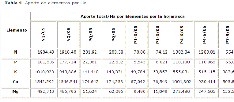 El cálculo de aporte de la hojarasca se realizó al determinar el aporte individual por el porciento de cada elemento, estos datos se presentan en los anexos del 4 al 8, y en el anexo 9 se presenta el aporte total por parcelas.