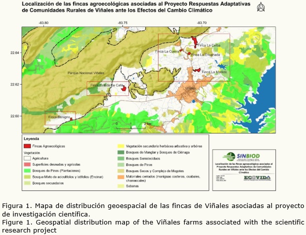 El uso de sistemas de información geográfico como herramientas para la gestión de sistemas agrícolas sostenibles asociados a la zona de influencia socioeconómica de áreas protegidas, de han venido implementando en diversas regiones a nivel global, en el caso de estudio de la investigación, se identifican e implementan mecanismos de mitigación y adaptabilidad climática en seis agroecosistemas asociados al área protegida Parque Nacional Viñales; a través de la innovación tecnológica, resiliencia y la mejora de la agrobiodiversidad, contribuyendo a la mitigación de los efectos del cambio climático en los sistemas agrícolas productivos como la pérdida de suelos, uso eficiente del agua, contribuir al ordenamiento territorial y ambiental, incrementar las acciones de capacitación y extensionismo relacionadas con la percepción de riesgos y medidas de enfrentamiento a los efectos del cambio climático. Haber realizado la evaluación integrada de los sistemas agrícolas productivos y la aplicación de medidas de adaptabilidad, favorece la mejora e incremento de la agrobiodiversidad en las áreas de estudio, respuesta adaptabilidad climática, así como el diseño de prácticas agroecológicas, contribuyendo al fortalecimiento de los sistemas agrícolas productivos. El estudio además propiciará la obtención de una base cartográfica a pequeña escala respaldada por una base de datos que complementa el manejo eficiente de estos sistemas agroecológicos.